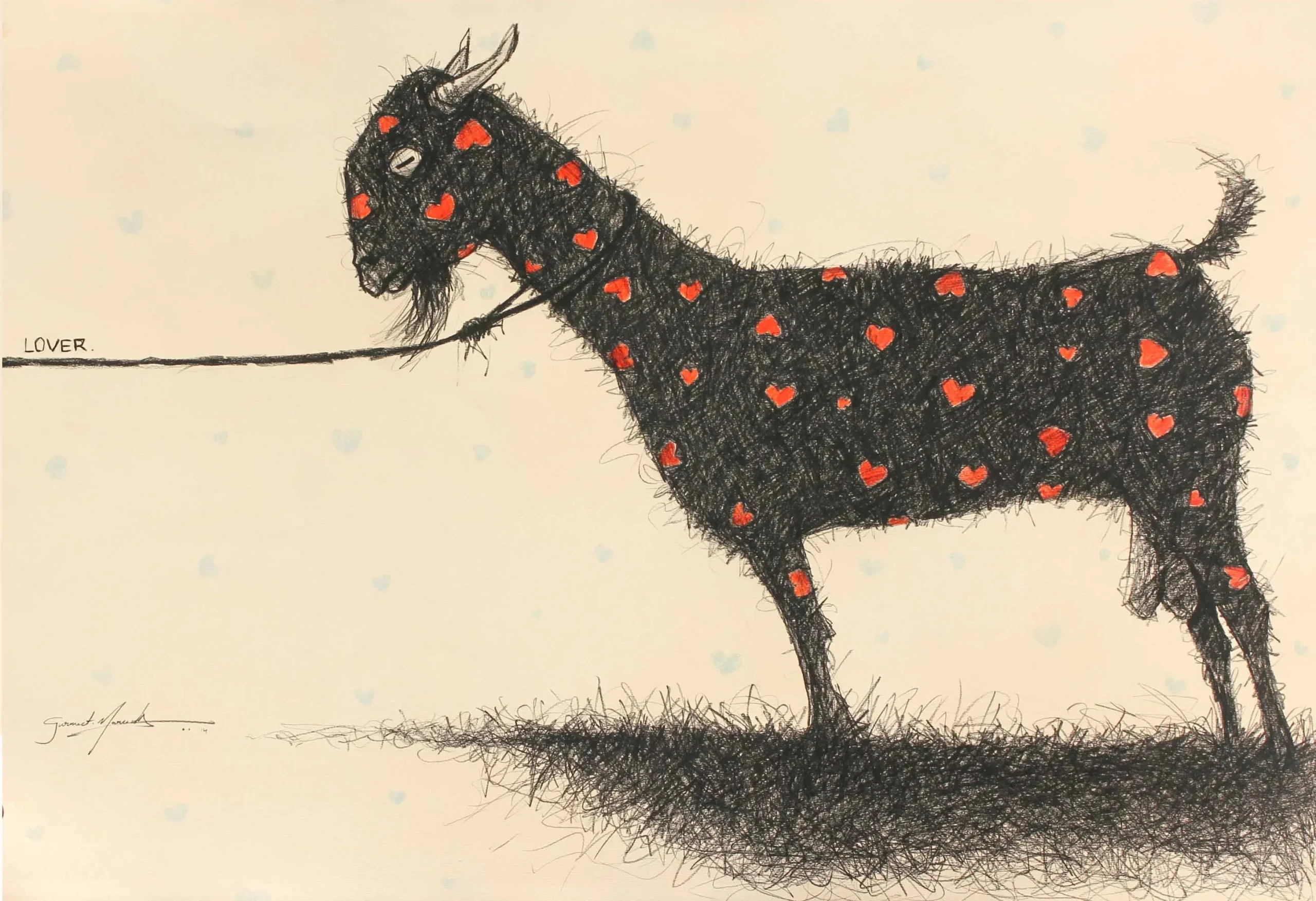 A black goat, marked with scattered red hearts, stands patiently on its leash. Love appears tender yet controlled, held back by strings that guide, restrain, and define its longing.