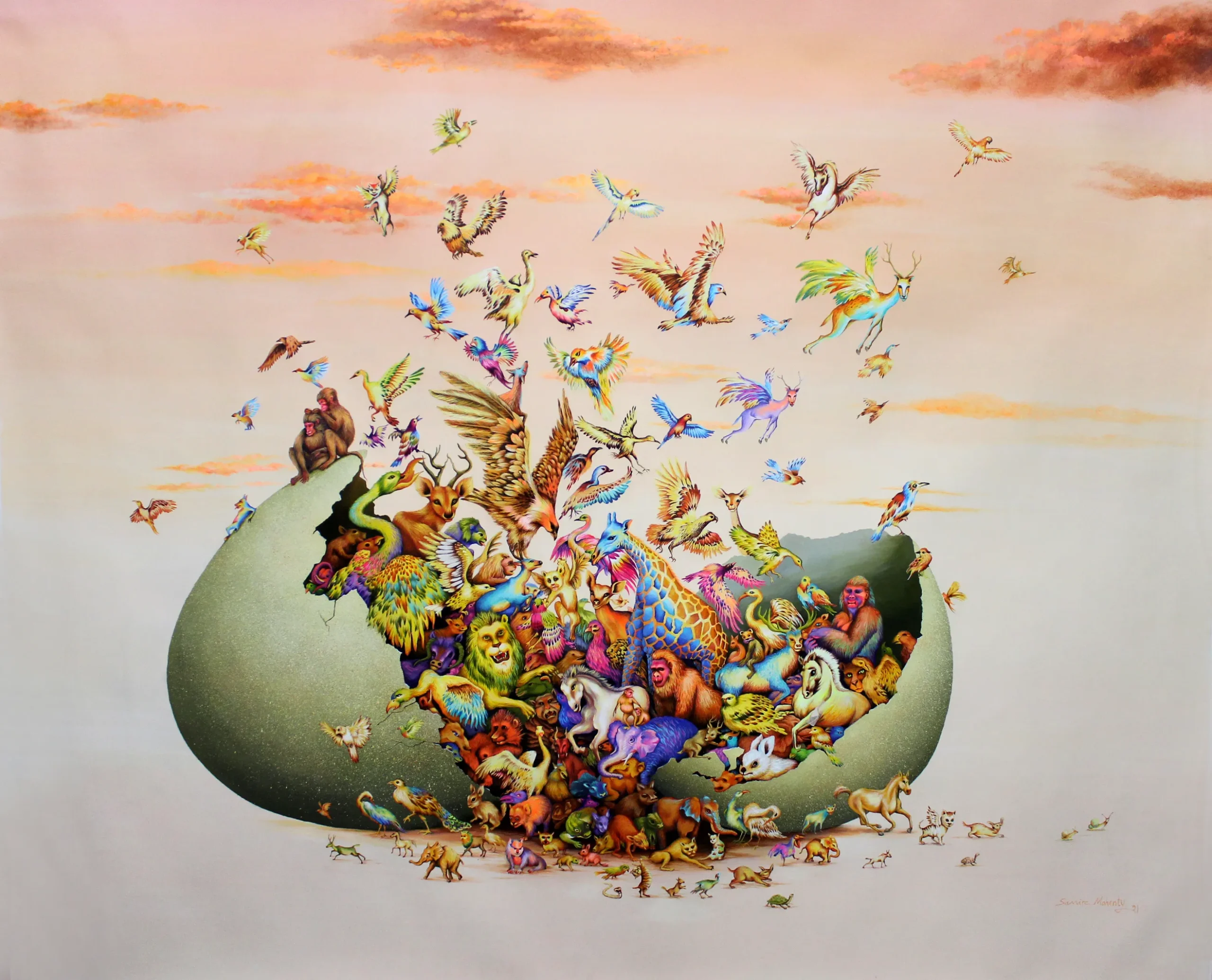 From a fractured shell, creatures surge skyward, hues colliding softly, suggesting beginnings unbound, where hoof converge into a single awakening beyond quiet horizons of becoming.