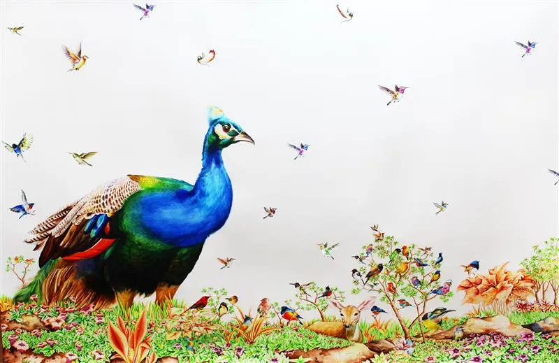 As morning opens, a peacock stands composed, color breathing outward across quiet terrain. Above and around, gentle stirrings invite the eye to drift and a measured promise of presence.