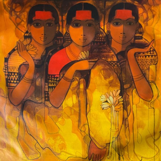 His artworks often feature women in vibrant, colorful saris and blouses that represent the raw colors of the earth, such as reds, golden yellows, oranges, dark blues, and greens. These colors help to portray the natural beauty and vitality of rural life. Sagare’s paintings often depict women in their daily lives, such as working in the fields, caring for their families, or participating in village activities. He captures their strength and resilience, as well as their grace and beauty, often showing them with a radiant smile and a sense of calm.