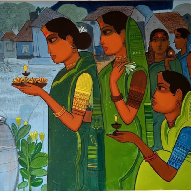 In his paintings, Sagare often portrays women holding flowers, a symbol of their connection to nature and their inner beauty. He also depicts them with diyas (oil lamps) in their hands or spending time by the river, reflecting moments of tranquility and connection with each other. These scenes highlight the romantic relationship between women and their environment. His use of delicate lines and vibrant colors brings out the simplicity and elegance of rural life, emphasizing the unexpressed voices and expressions of the women he portrays.